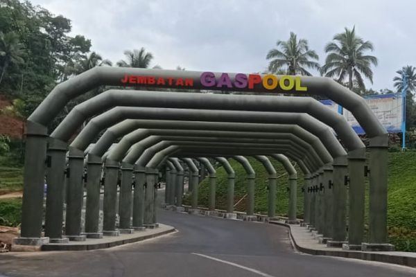 Ada lagi yang membuat kita berdecak kagum, saat melintasi sebuah sungai, kita akan melintasi sebuah jembatan keren yang bertuliskan “JEMBATAN GASPOOL” yang diambil dari nama salah satu perkumpulan yang membiayai terselenggaranya percepatan pembangunan di Desa Sukamulya.
